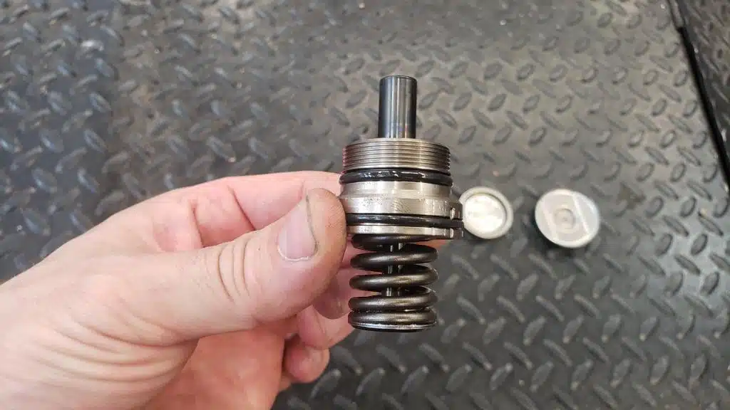 This is the top of the pump body with the damper removed. There’s an inlet screen in the top. What I first assumed is a pressure relief valve, but later discovered is a one way check valve responsible for maintaining fuel pressure in the rail when the pump isn’t pumping. A passage to the piston on the bottom. And two passages to the pressure regulator valve on the left.
